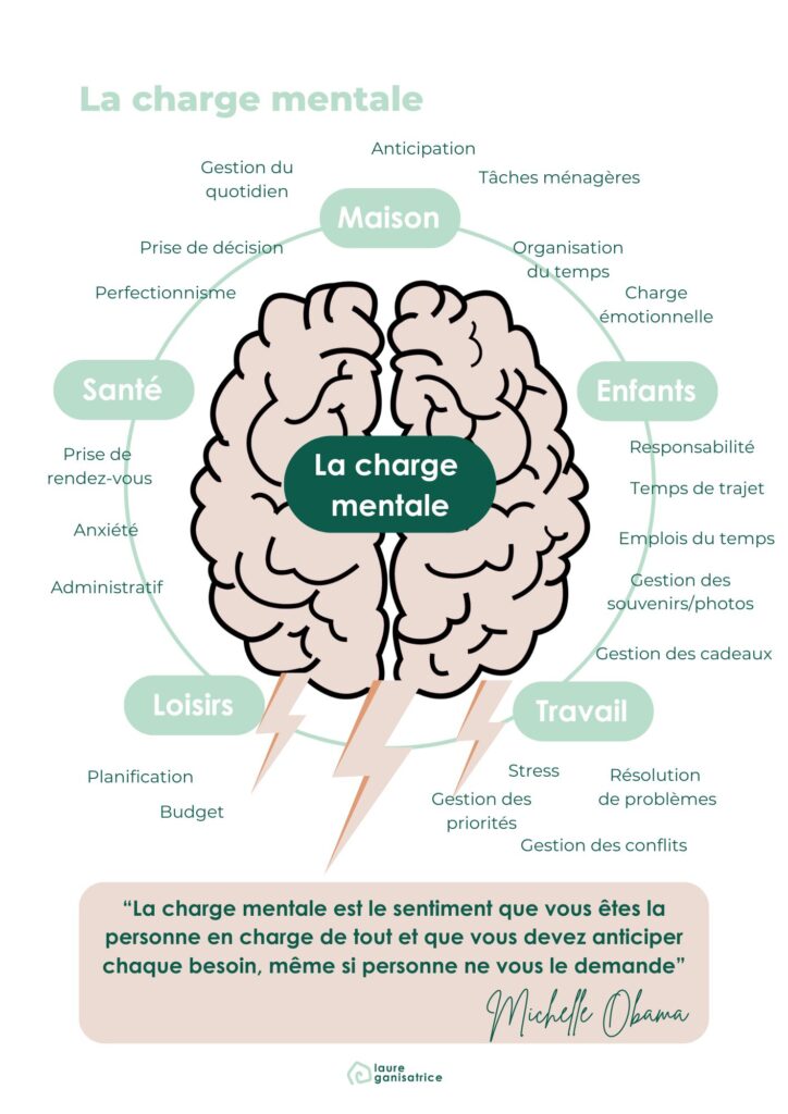 La charge mentale ne se résume pas aux tâches ménagères. Elle englobe l’ensemble de la gestion invisible du quotidien : anticiper, planifier, coordonner, vérifier, rappeler.